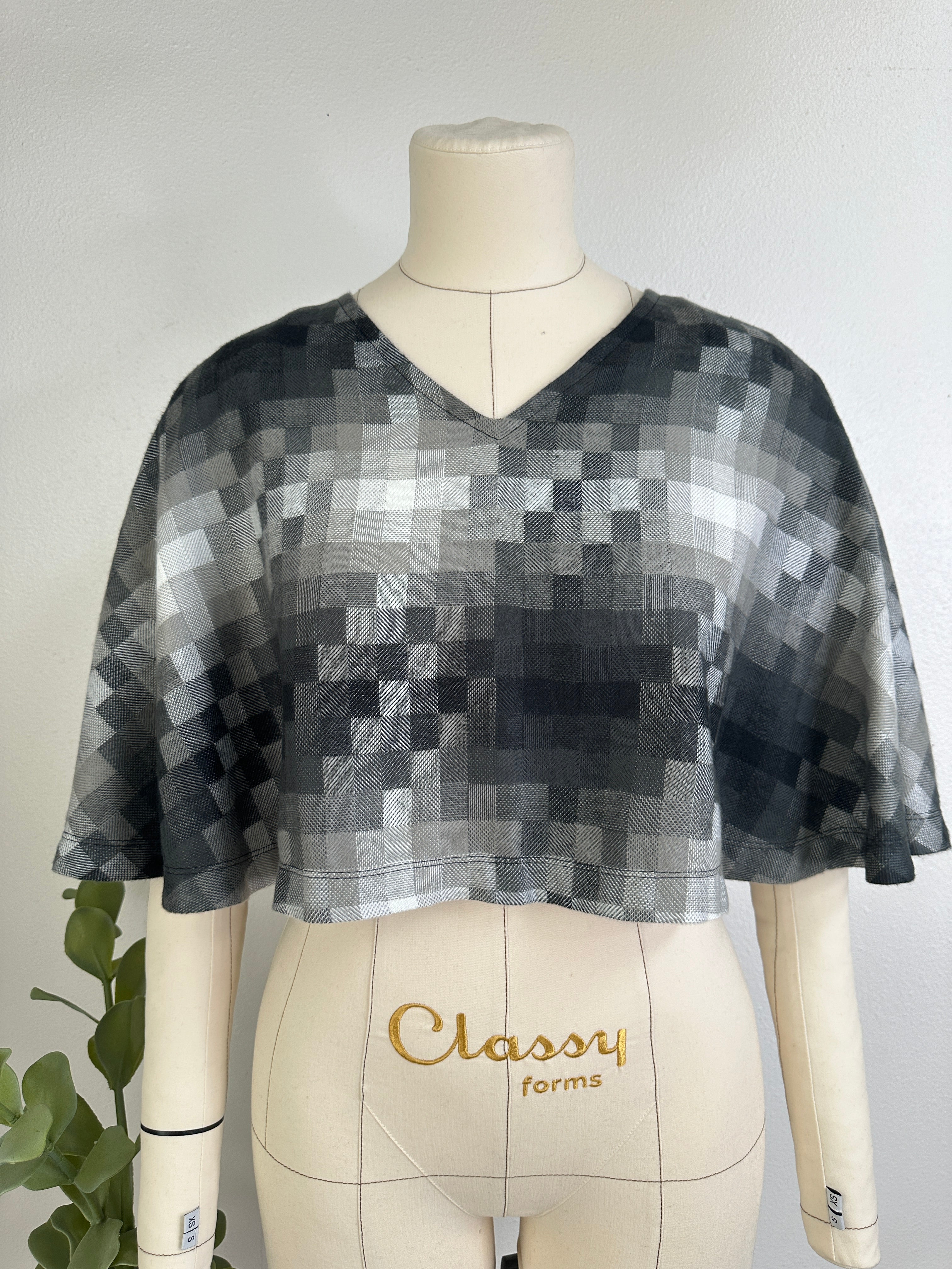 Layer up and add a bit of a fuzzy vibe to your outfit with this cropped capelet. The fabric has an open mesh weave with an eyelash-like texture.